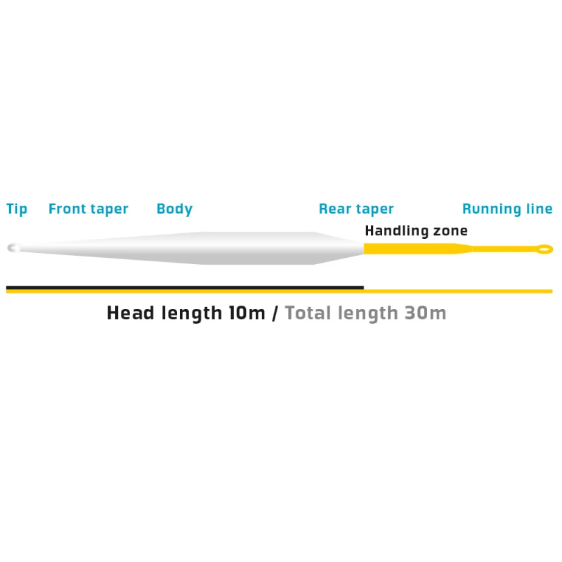 Het heeft ook verschillende hardheidslagen in verschillende delen van de lijn; de kop is zachter waardoor je pijlvormige strakke lussen kunt maken en de looplijn is harder voor het dragen van extra lange overhangen en ultieme schietbaarheid. De vliegenlijn heeft super kleine lussen aan beide uiteinden en duidelijke markeringen van het lijngewicht in de buurt van de tip van de lijn.